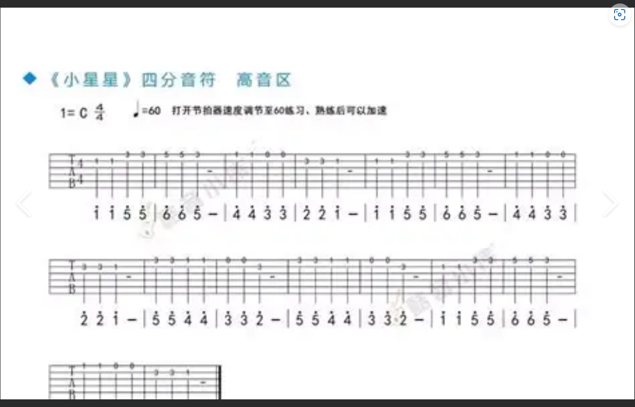 练习方法: 缓慢弹奏《小星星》,每次按弦时都仔细检查按弦位置,确保音准。