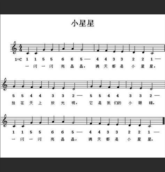 现在,拿起你手边的儿歌简谱(好比《小星星》),通常简谱上只标有旋律音符,我们需要自己配上和弦。